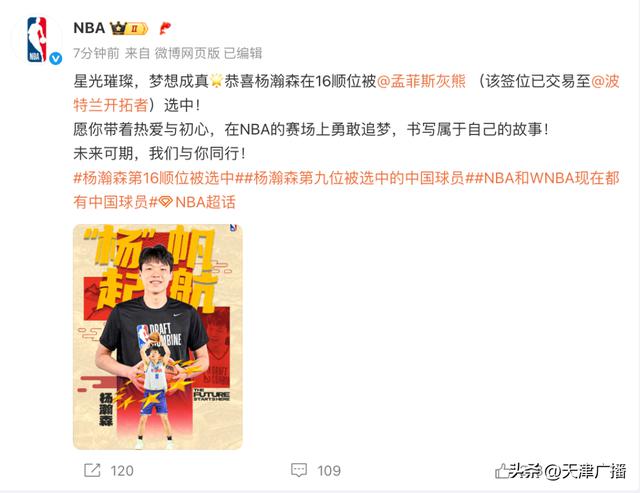 刚刚,#杨瀚森第16顺位被选中#冲上微博热搜第一。