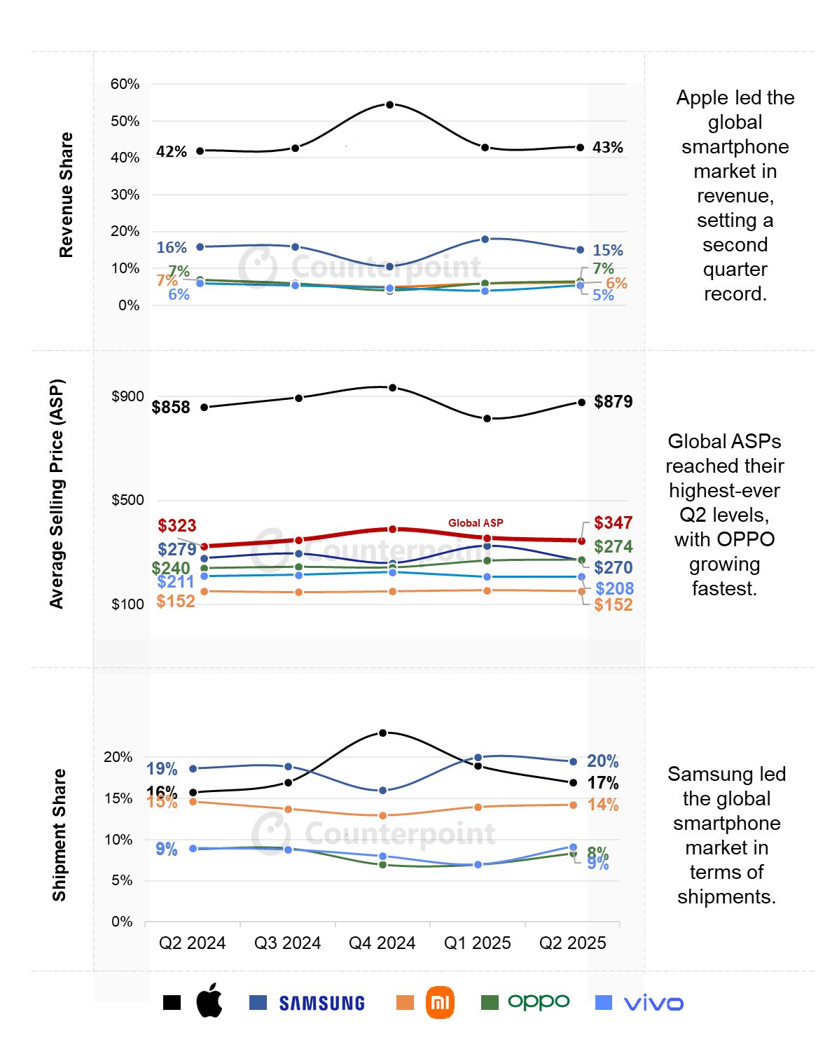 报告还指出全球平均销售价格(ASP)也达到第二季度峰值,同比增长 7%,达到 347 美元。其中苹果公司的 iPhone 平均销售价格最高,为 879 美元(IT之家注:现汇率约合 6331 元人民币);而 OPPO 的平均销售价格增长最快,第 2 季度平均价格为 274 美元。